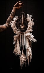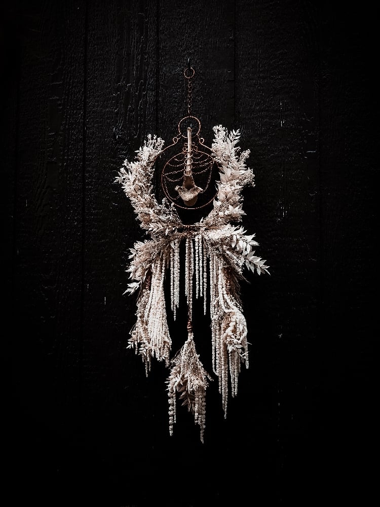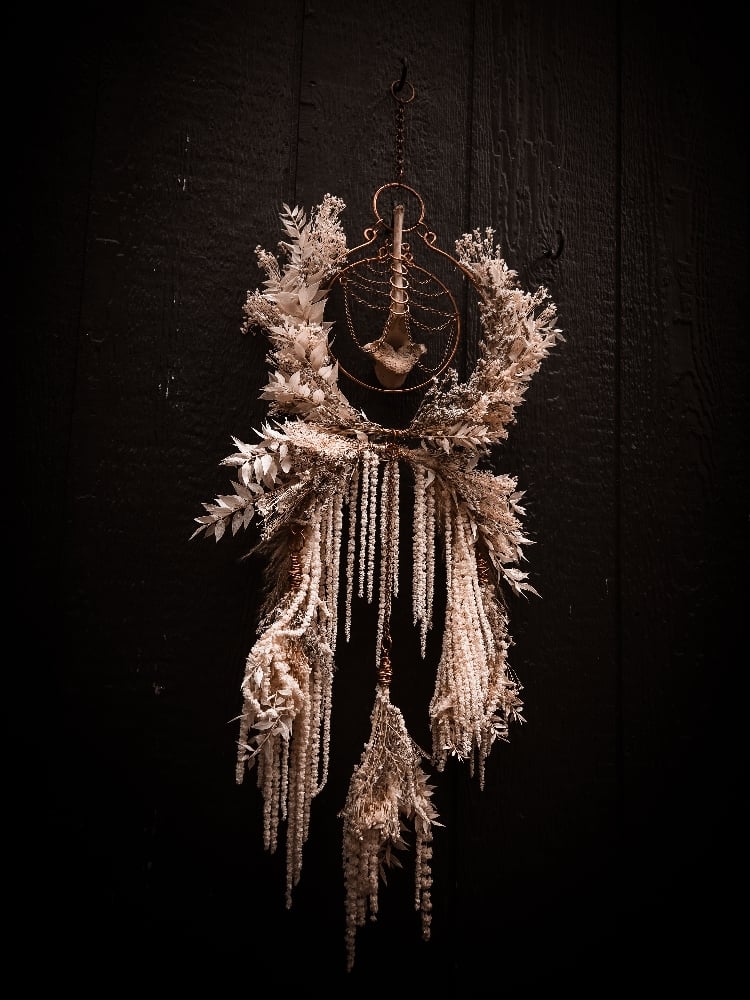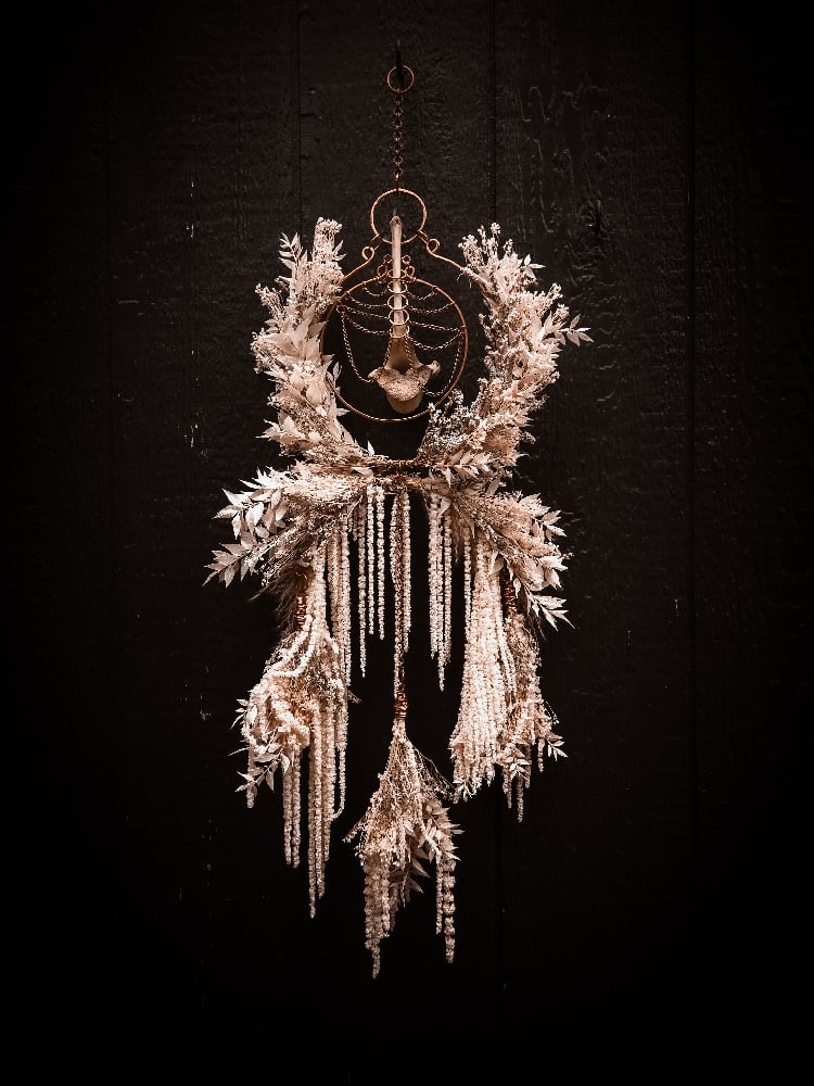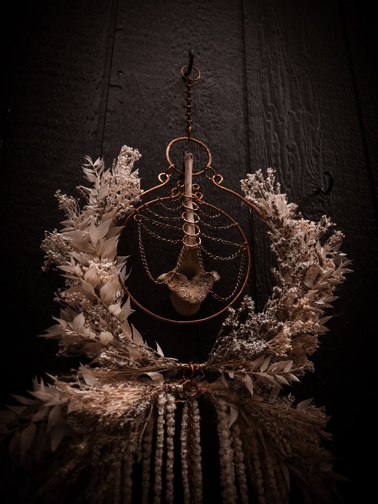 copper, copper/iron alloy chain, preserved assorted flora, and a scavenged elk vertebra.