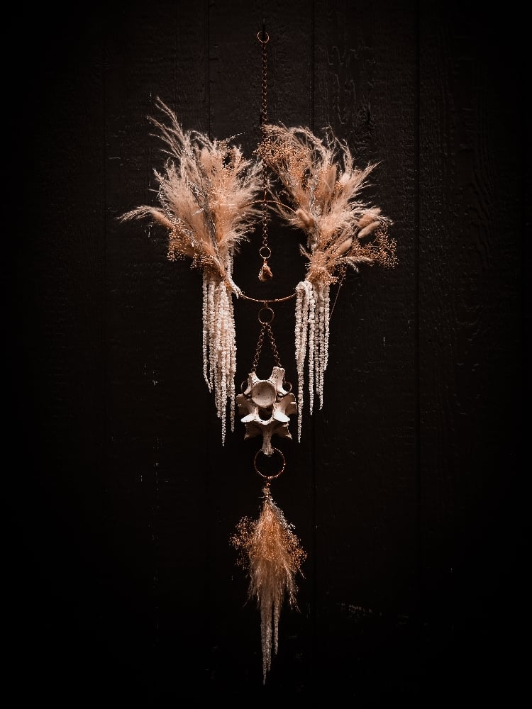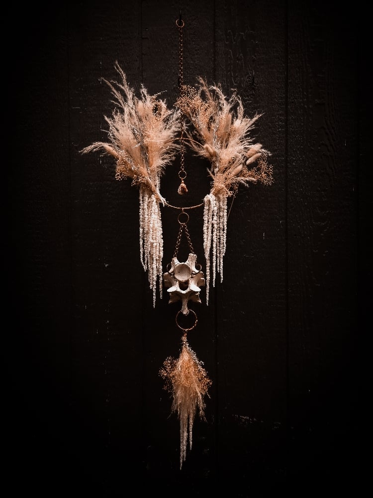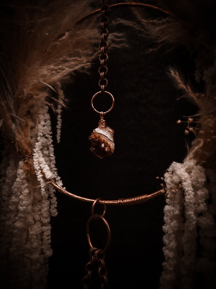 copper, copper/iron alloy chain, preserved flora, citrine, and scavenged fused elk vertebrae