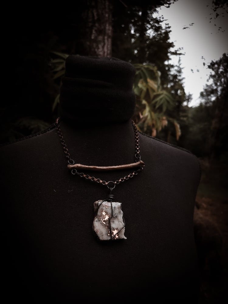 copper, copper/iron alloy chain, moss agate with embedded copper and scavenged coyote bone necklace.