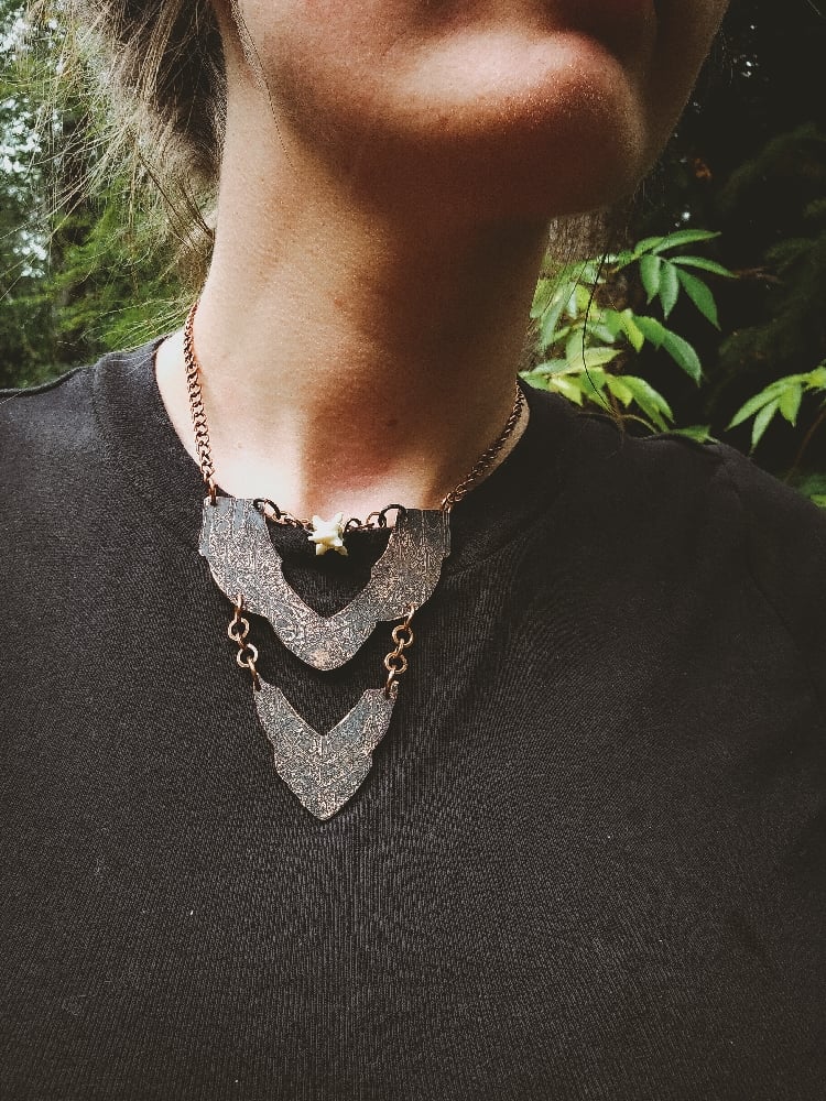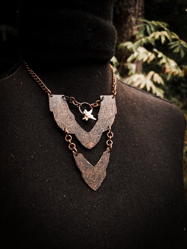 copper, copper/iron alloy chain, and a scavenged snake vertebra